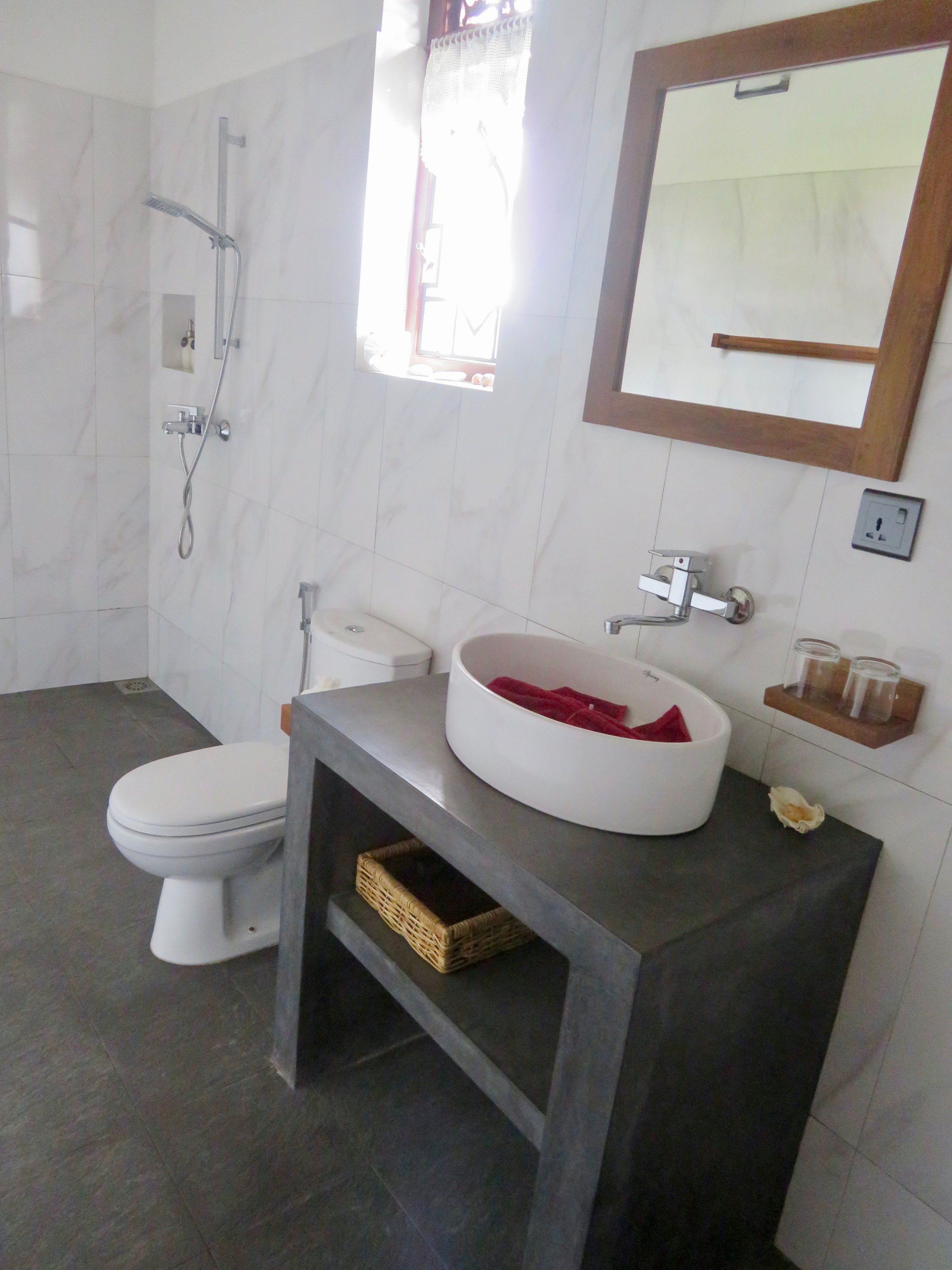 - Large bathroom with shower, toilet, hot and cold water, hairdryer, towels